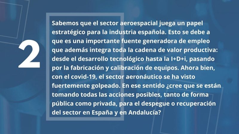Hacen falta medidas de reactivación del sector, tal que se puedan mantener los casi 15000 puestos de trabajo que existen en él, y poner en valor las capacidades de tantas pymes andaluzas y españolas, para conseguir aumentar la carga de trabajo de nuestra industria. El sector aeroespacial es un sector crucial en nuestro país, y debemos trabajar todos en su rápida recuperación, tanto a nivel público como privado, encontrar sinergias y establecer un plan de futuro conjunto.