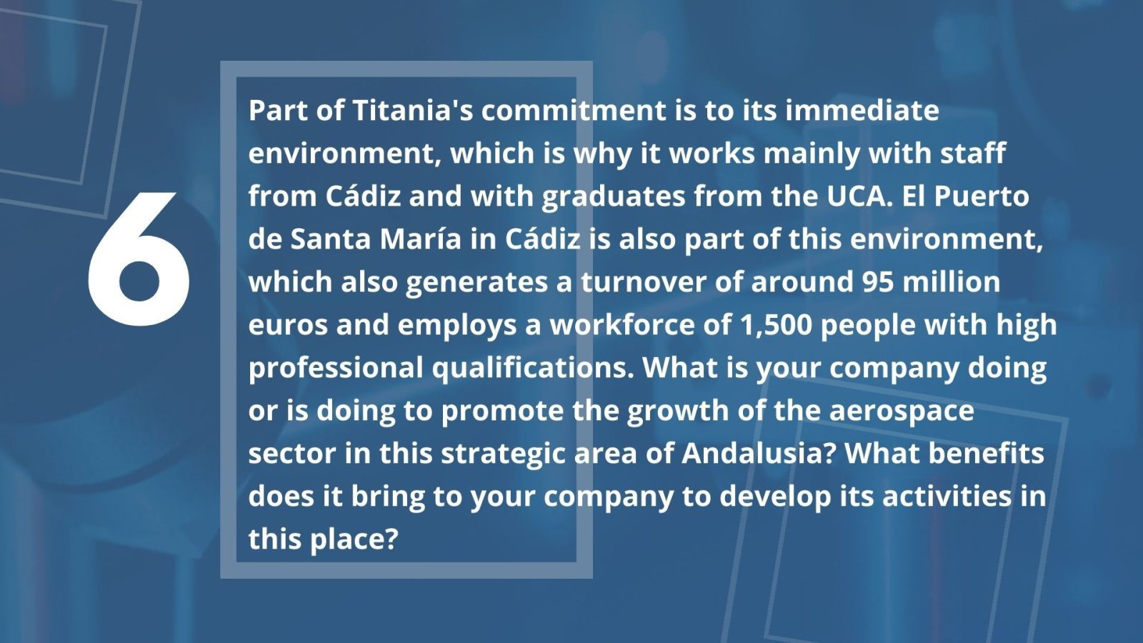 From Titania we see, through the test plans that we are asked for, that Andalusian companies compete hard and enter into new programmes, technologies, markets and even emerging businesses. In short, they try to go beyond supporting Airbus plants at regional level.